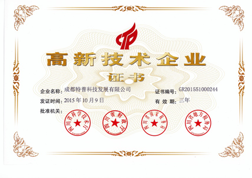 今年下半年,經(jīng)企業(yè)申報、專家評審、公示等程序,成都特普科技發(fā)展有限公司取得由四川省科學(xué)技術(shù)廳、四川省財政廳、四川省國家稅務(wù)局、四川省地方稅務(wù)局共同頒發(fā)的高新技術(shù)企業(yè)證書,證書編號:GR201551000244,發(fā)證時間2015年10月9日,有效期:三年。